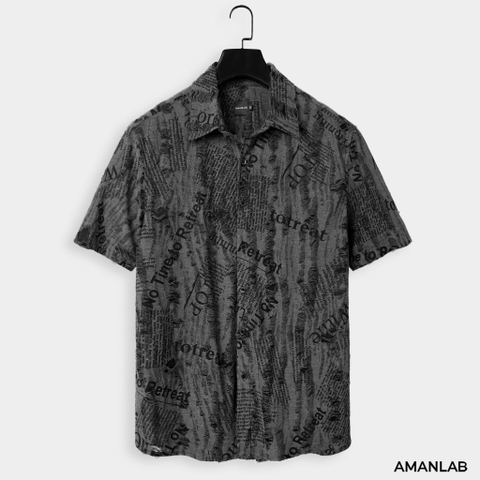 Chi tiết áo sơ mi nam ngắn tay họa tiết chử tờ báo lộn xộn AMANLAB