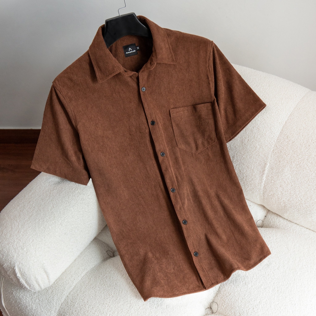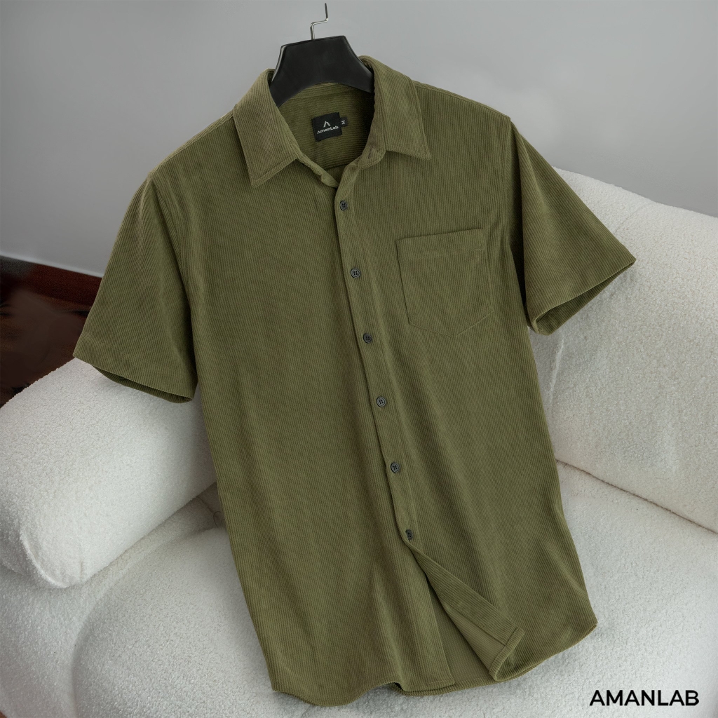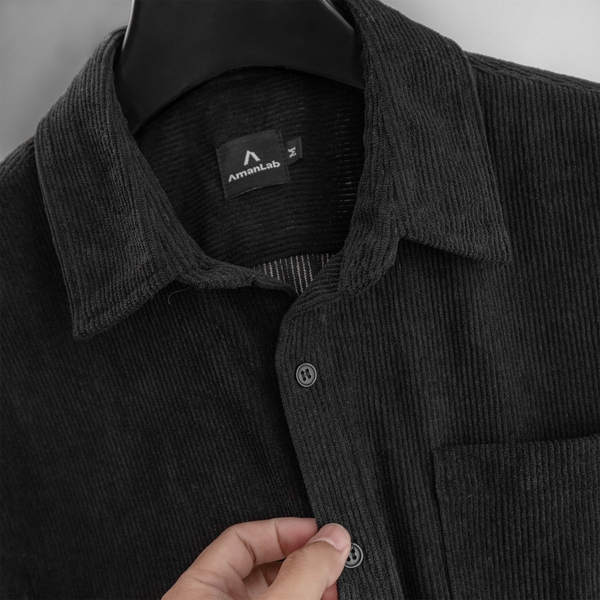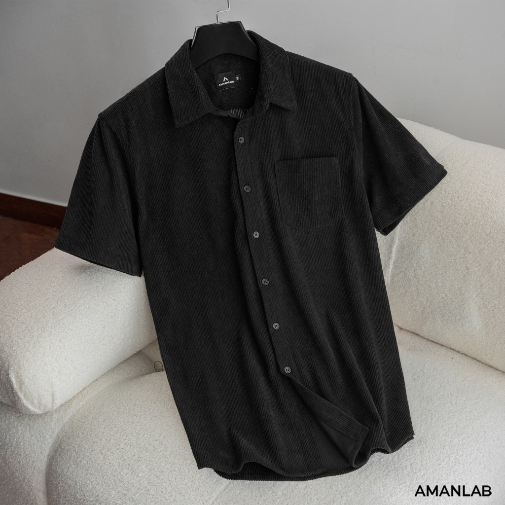 Chi tiết áo sơ mi nam nữ ngắn tay chất vải cotton nhung tăm , form áo suông rộng, regular AMANLAB